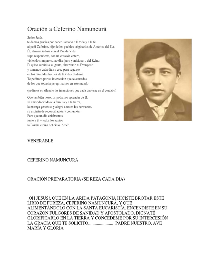 Yo le contesté que si y cuando le dije que mi oración había sido a Ceferino Namuncurá se desinfló porque el había pensado que yo había invocado al fundador de ellos que es Juan María de la. Oración para pedir su intercesión BEATO CEFERINO NAMUNCURÁ Señor Jesús te damos gracias por haber llamado a la vida y a la fe al peñi Ceferino hijo. Él quiso ser útil a su gente abrazando tu Evangelio.
